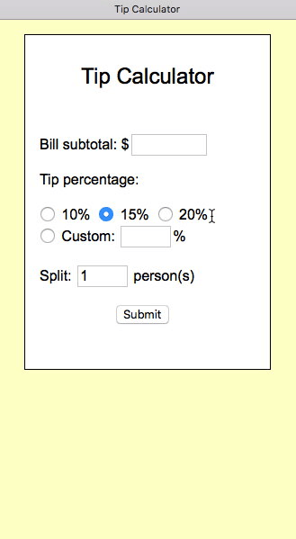 - If all values were valid, display the amount of the tip and the total bill when the tip is included in a box below the form. Be sure to format the values properly as currency. This result box should not display the first time the page loads (only after a form is submitted).