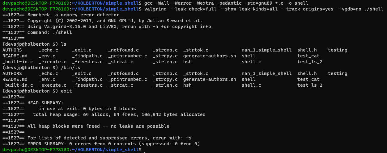 valgrind --leak-check=full --show-leak-kinds=all --track-origins=yes --vgdb=no ./shellThis shell can be executed in two different ways: