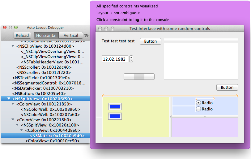 BFAutoLayoutDebugger is very simply framework that can display the view hierarchy of your app's main window. Selecting any of the views from the list will visualize the constraints affecting the layout of those views using the NSWindow helper method visualizeConstraints:.