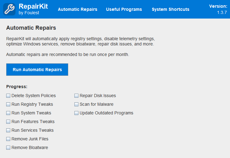Every function in the repair is fully customizable, allowing you to enable or disable specific repairs as needed using either the checkboxes on the panel, or the configuration files located in the config folder. Only modify these files if you know what you are doing.