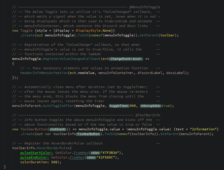 visualElement.HoverBorderPulse(pulseStartColor: GetColor.FromHex("#7F3B3A"), pulseEndColor: GetColor.FromHex("#2F569C"), colorDuration: 500);Example complex animation sequence: AnimFadeInSequence()