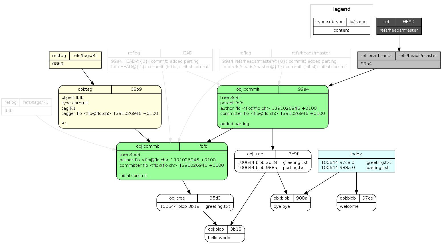 git-draw draws nearly the full content of a tiny git repository as a graph. For example after the following few git commands